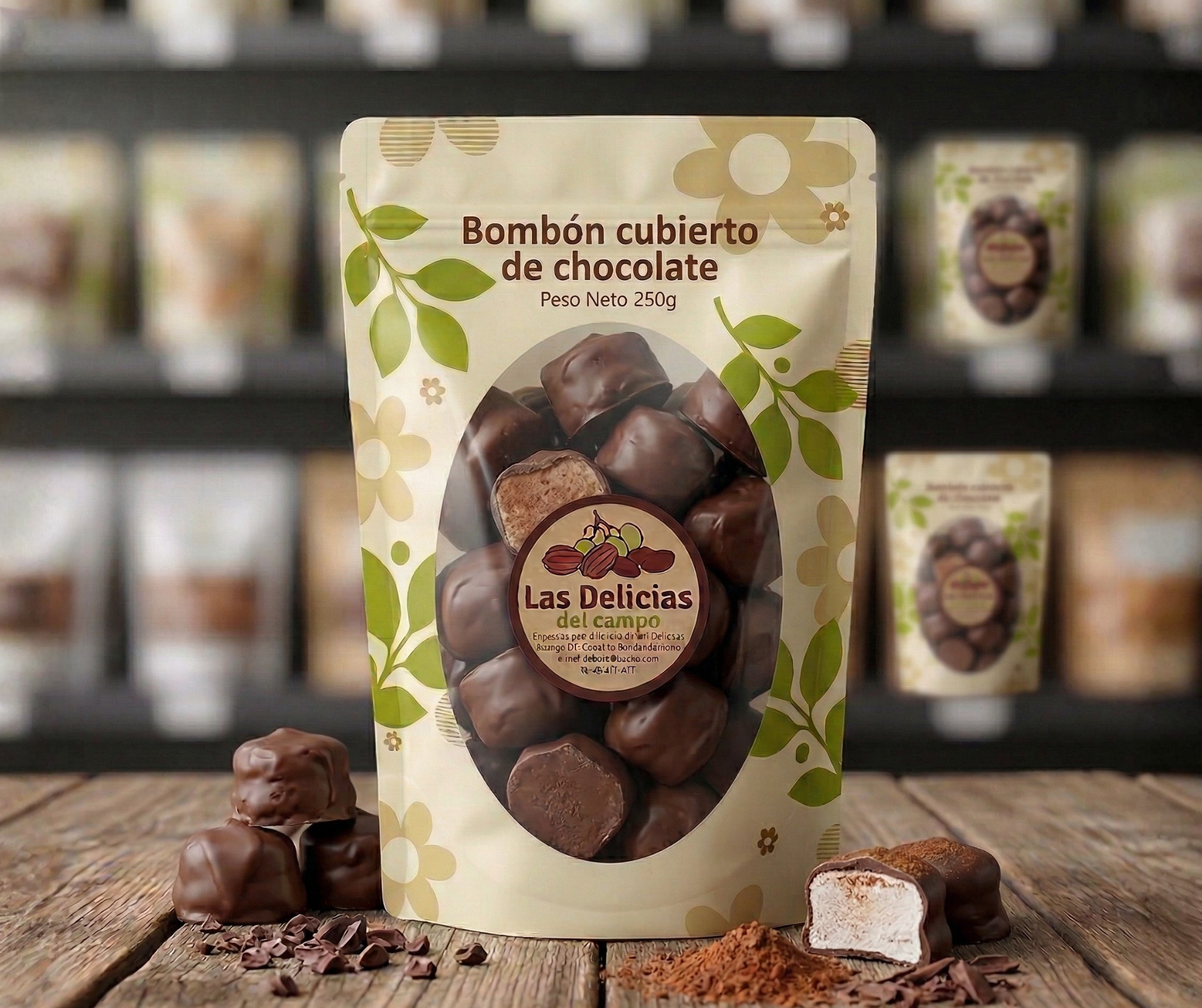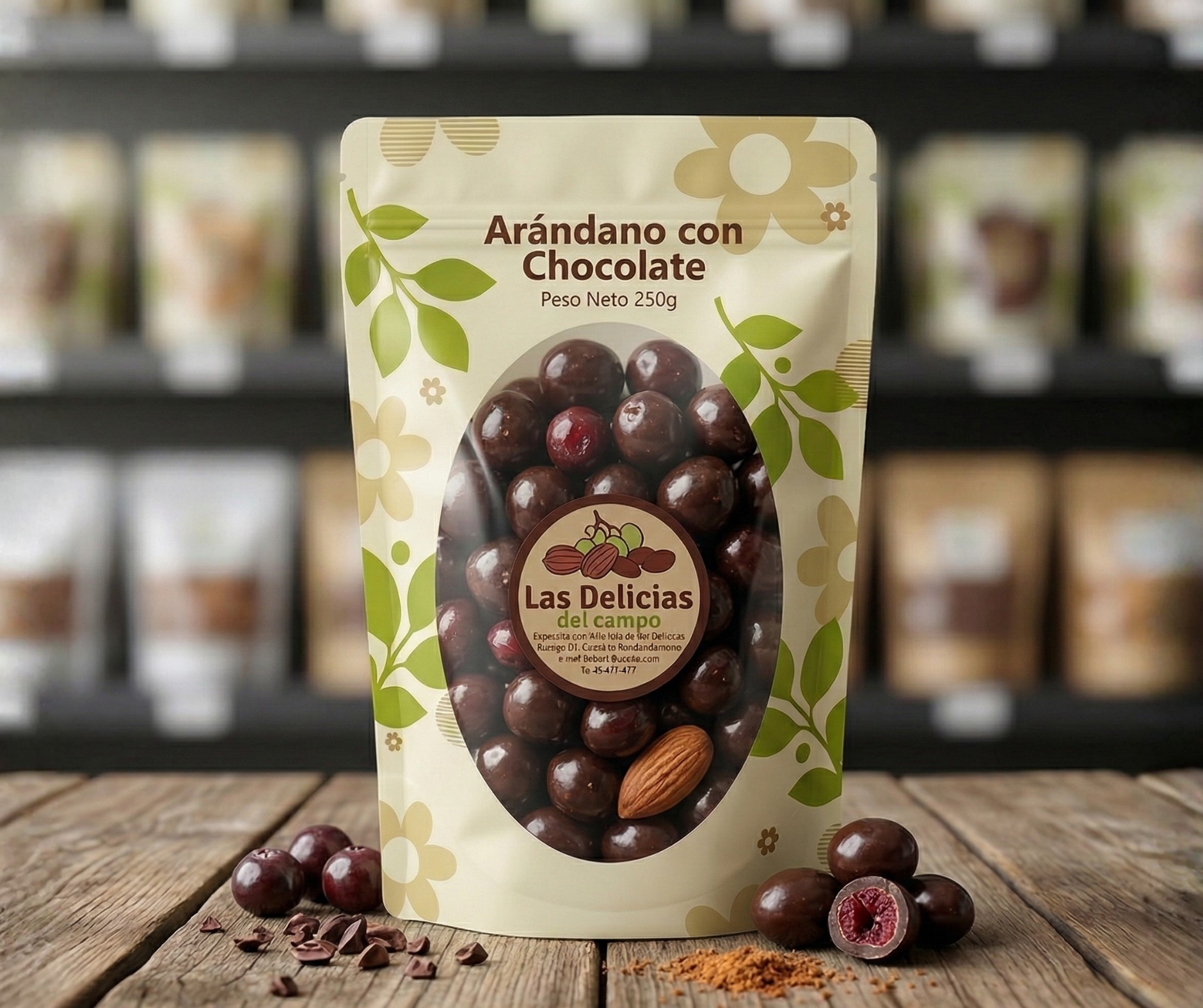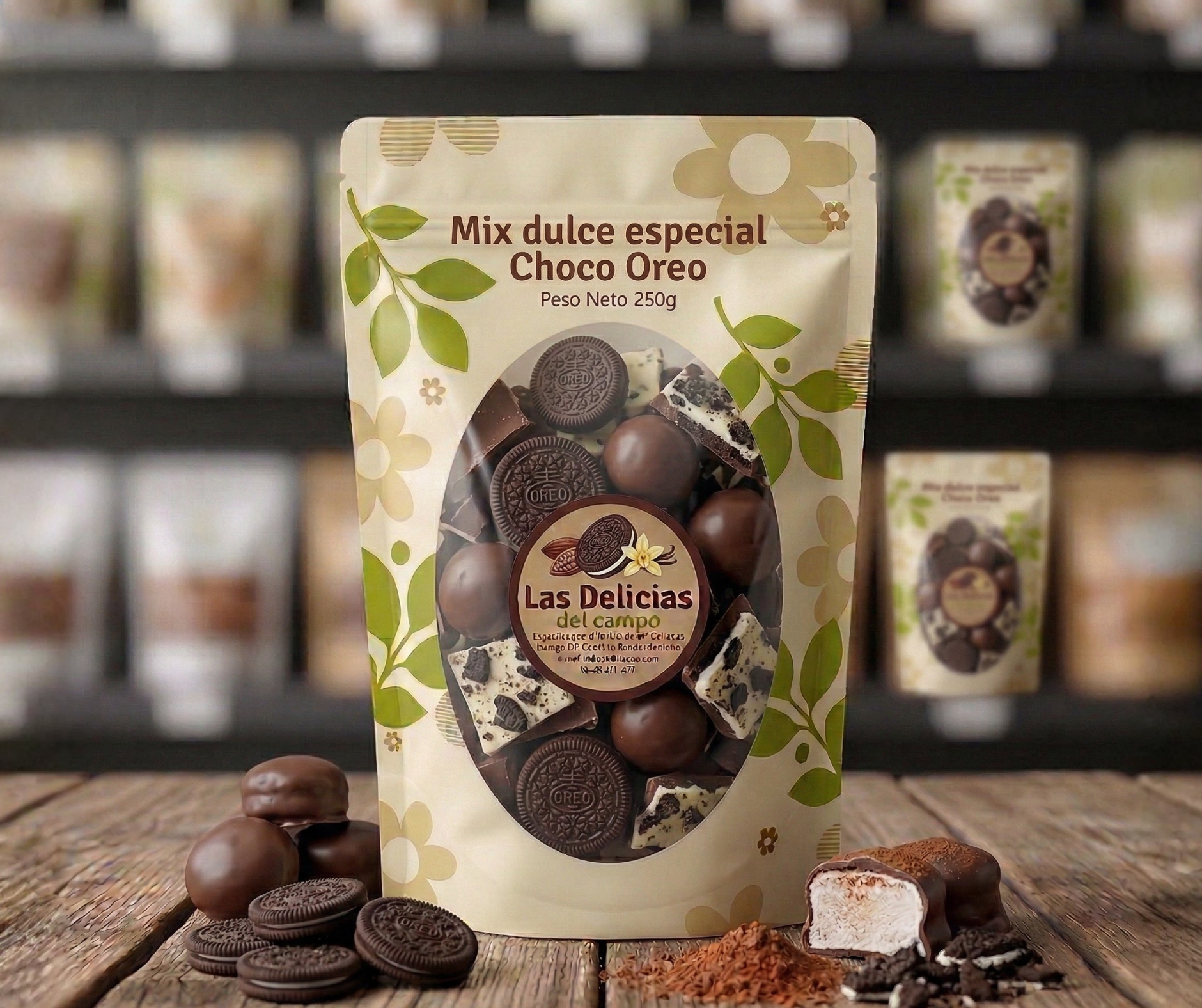 Almendra con chocolate 200 gr, arándano con chocolate 200 gr, bombón cubierto con chocolate 150 gr, choco oreo 200 gr, almendra confitada 200 gr.