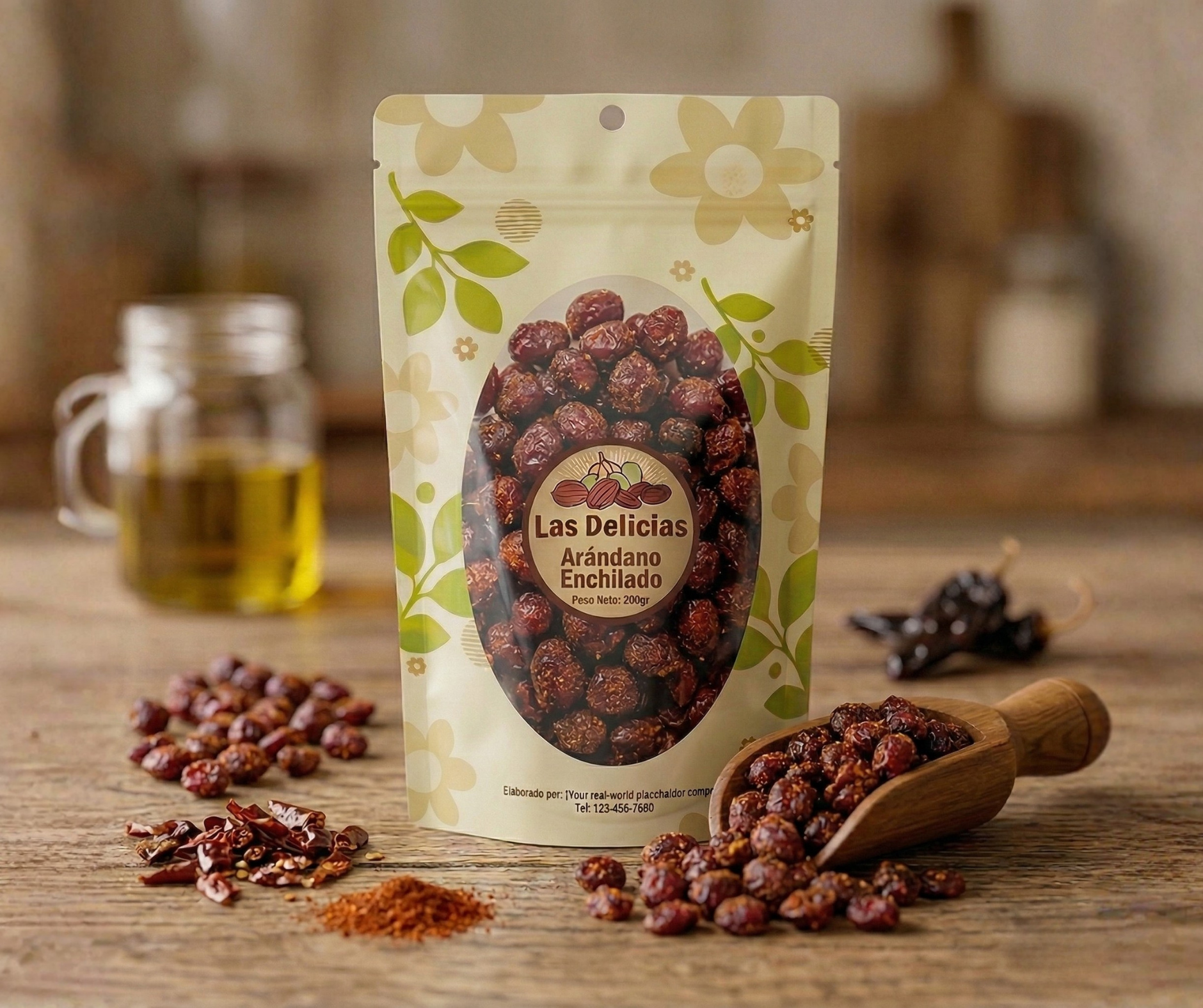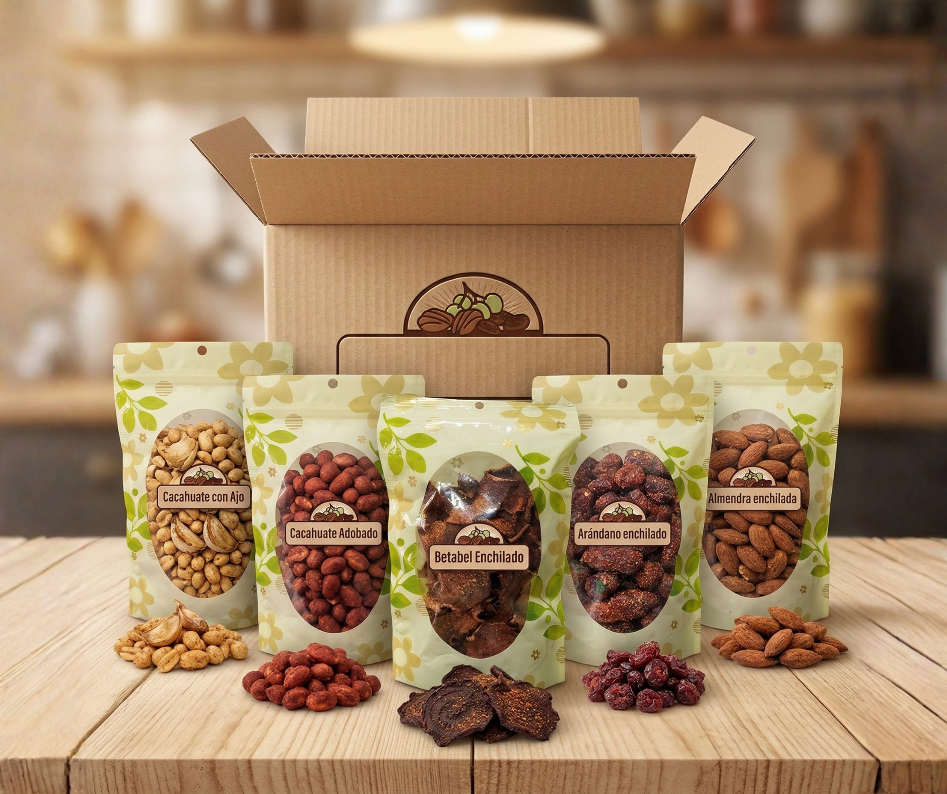 Cacahuate español con ajo 200 gr, cacahuate adobado 200 gr, betabel enchilado 80 gr, arándano enchilado 200 gr, pistache enchilado 200 gr.