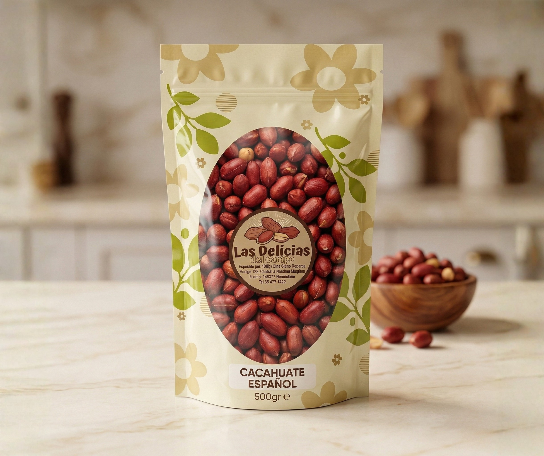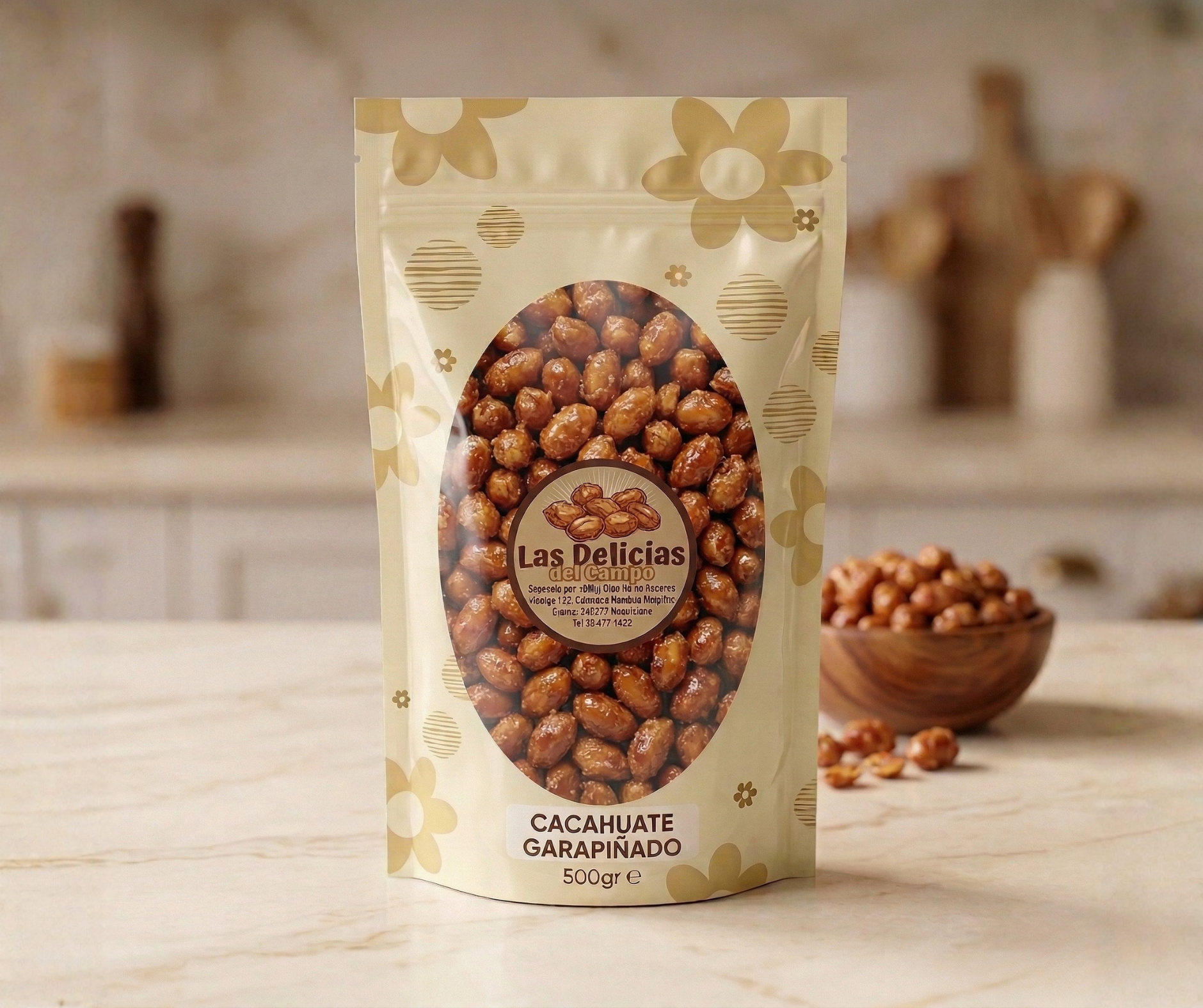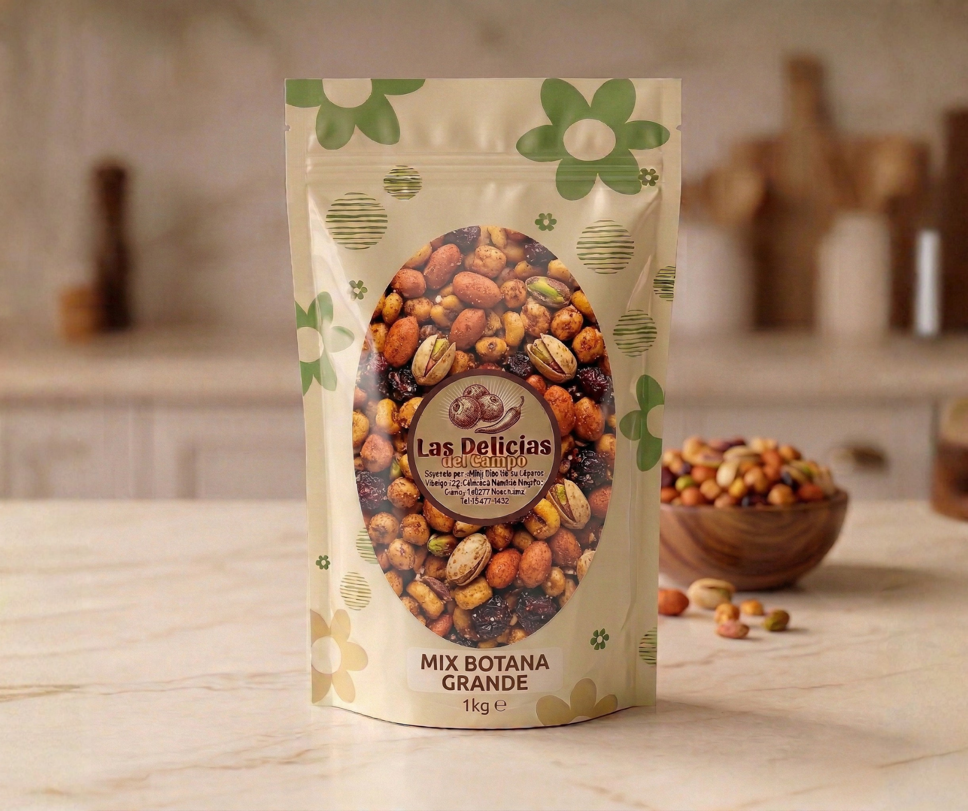 Todos los productos en una presentación de 500 gr: cacahuate japonés, cacahuate español, cacahuate español con ajo, cacahuate garapiñado con ajonjolí, almendra con chocolate, arándano enchilado, botana papa con tajín, producto sorpresa papatina.