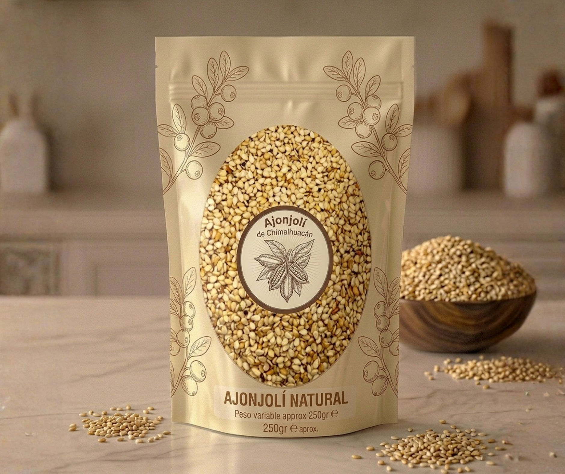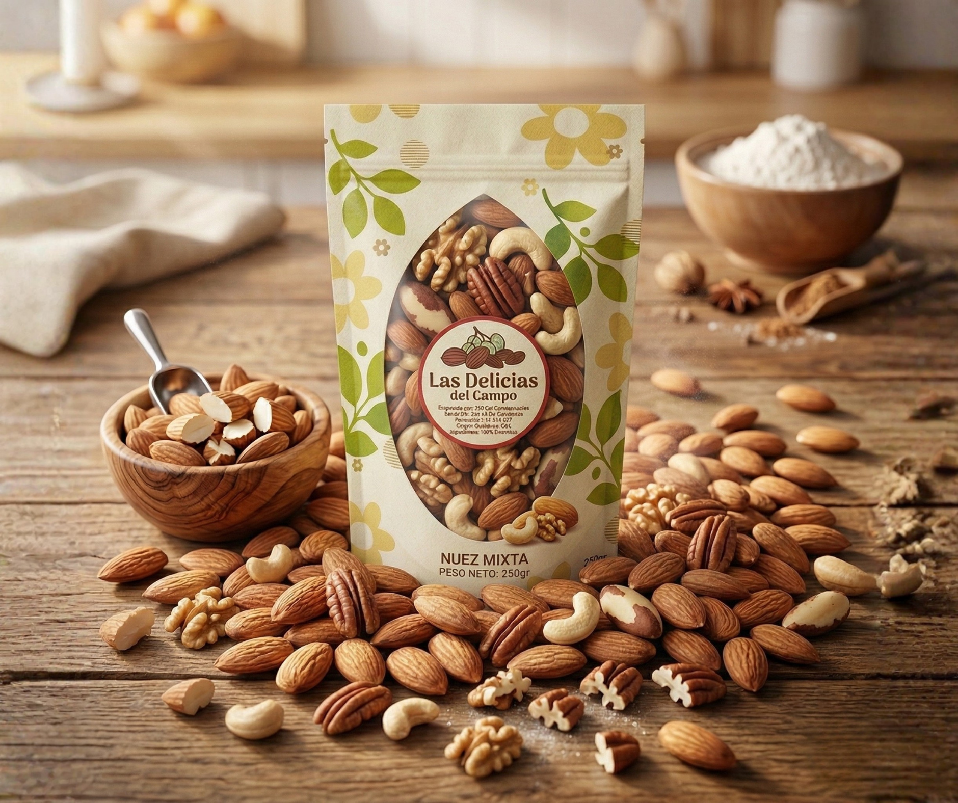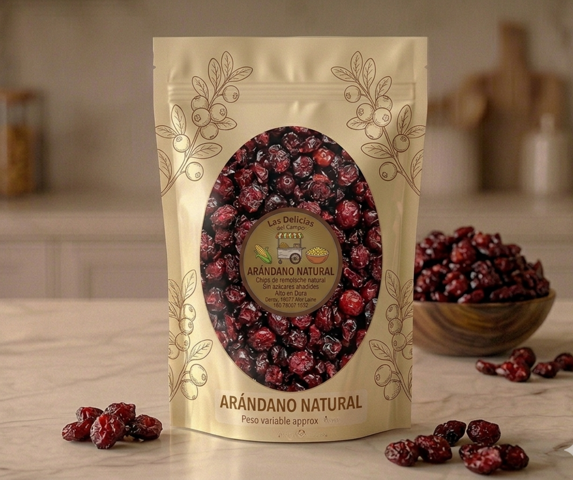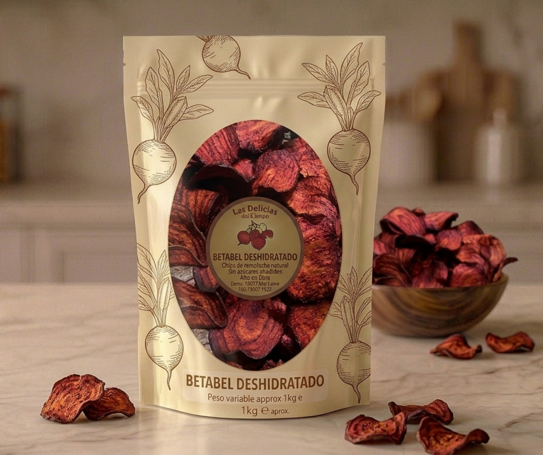 Betabel natural 80 gr, plátano horneado 150 gr, nueces mixtas 200 gr, arándano natural 200 gr, ajonjolí garapiñado 200 gr.