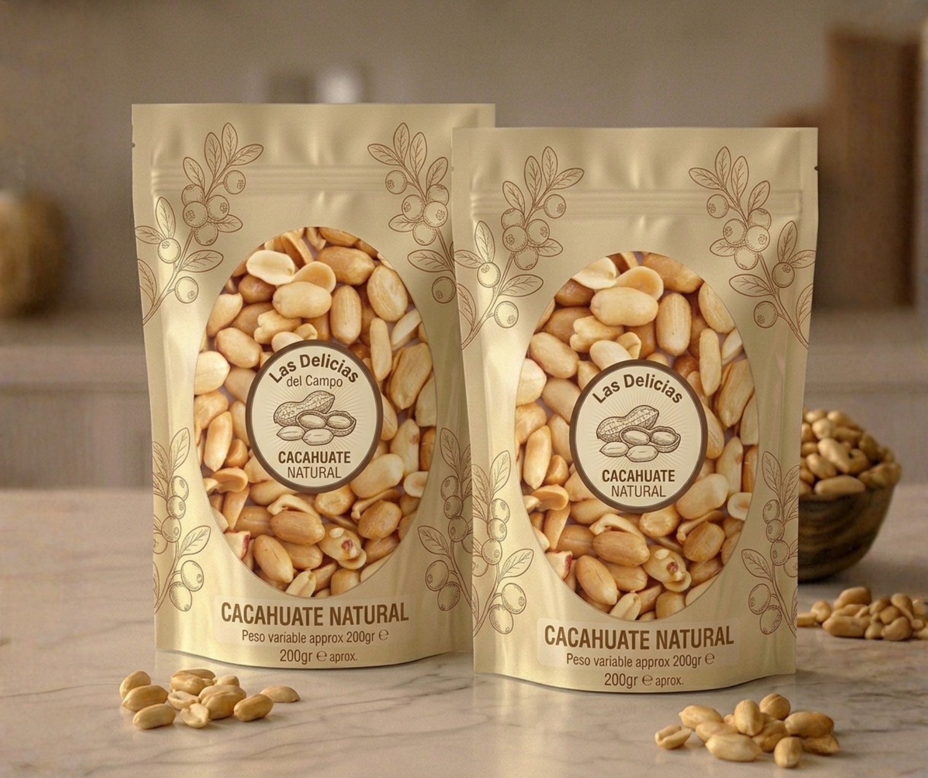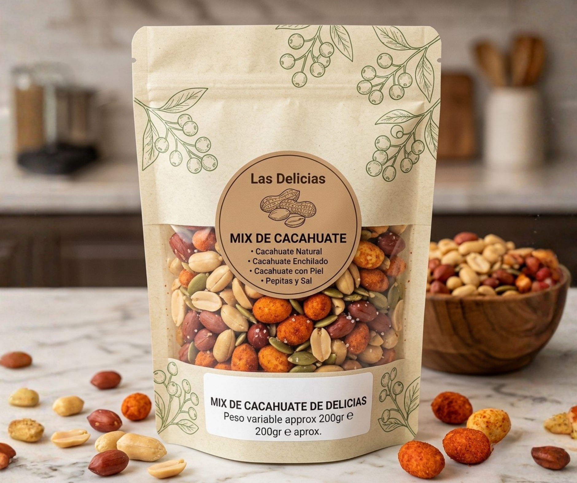 Cacahuate (dos paquetes de diferentes cacahuates) 200 gr cada uno, cacahuate mix 200 gr, ajonjolí garapiñado 200 gr, arándano enchilado 200 gr.